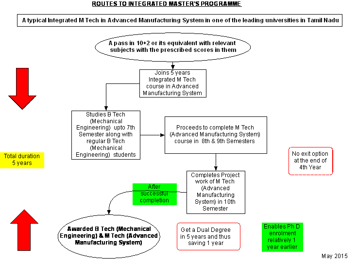 While we are all aware of the Lateral entry to Undergraduate BE/BTech programmes through Polytechnic Diploma route, some of us are not aware of the Integrated Master’s degree programmes. For e.g. successful 10+2 students could get admission into 5 years integrated MTech programme and save 1 year. That is, if a student wants to study for BTech and then M Tech, he or she needs to study B Tech for 4 years and M Tech for 2 years. However, this innovative Integrated programme enables students to qualify for M Tech in 5 years. Using a Flowchart I have illustrated a typical Integrated Master’s Programme at one of the leading Private universities in Tamil Nadu. The advantages are: (i) students are able to complete their Master’s programme in 5 years; (ii) obtain a Dual degree in 5 years; and (iii) should they wish to enrol for their Ph D programmes they can do it relatively one year earlier than other students, who take 6 years to enrol for their PhD programmes.